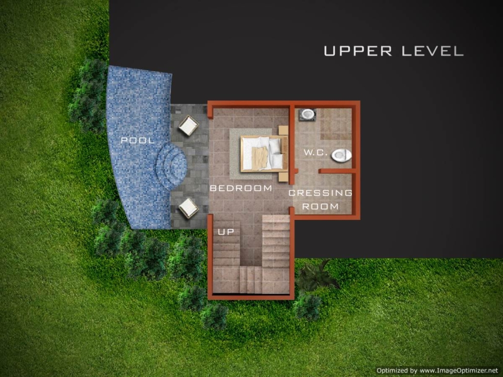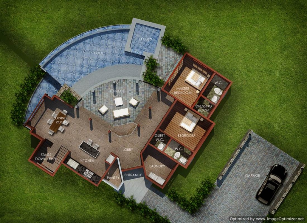 This home can be positioned at angles or square to lot. The roof design is intricate and follows complicated corners and angles. Various sized windows and scattered stone facade. These details create an artistic balance and harmony. The home serves well on a corner lot as the home wraps at two sides. The master suite has complete privacy with a plunge pool in front. The infinity-edge of the main pool feeds the plunge pool which also creates a water feature for the master bedroom.
