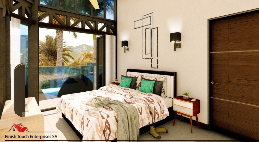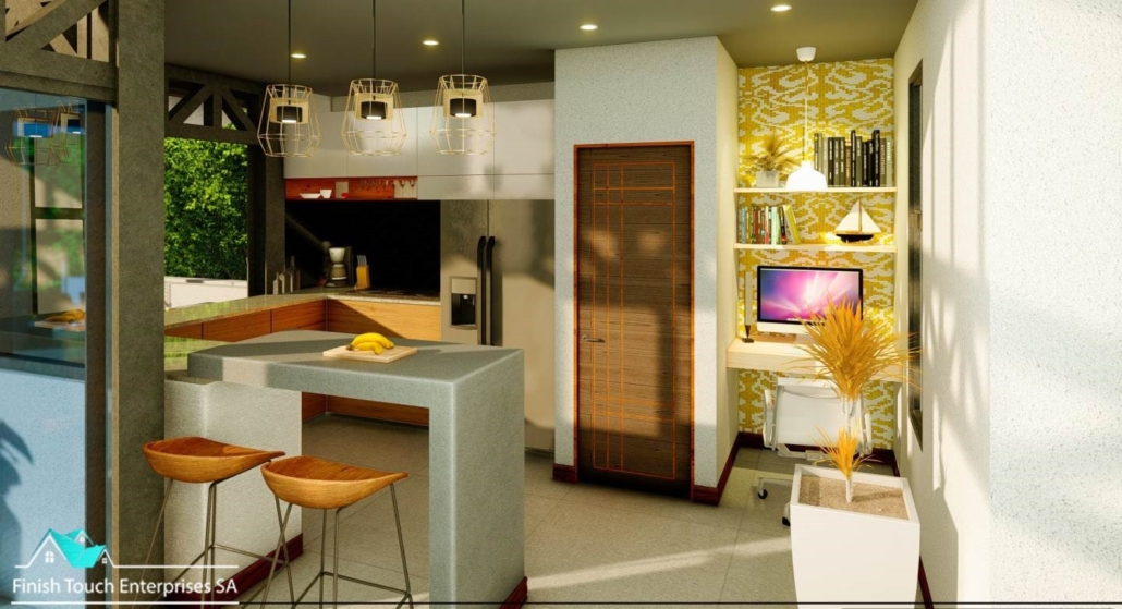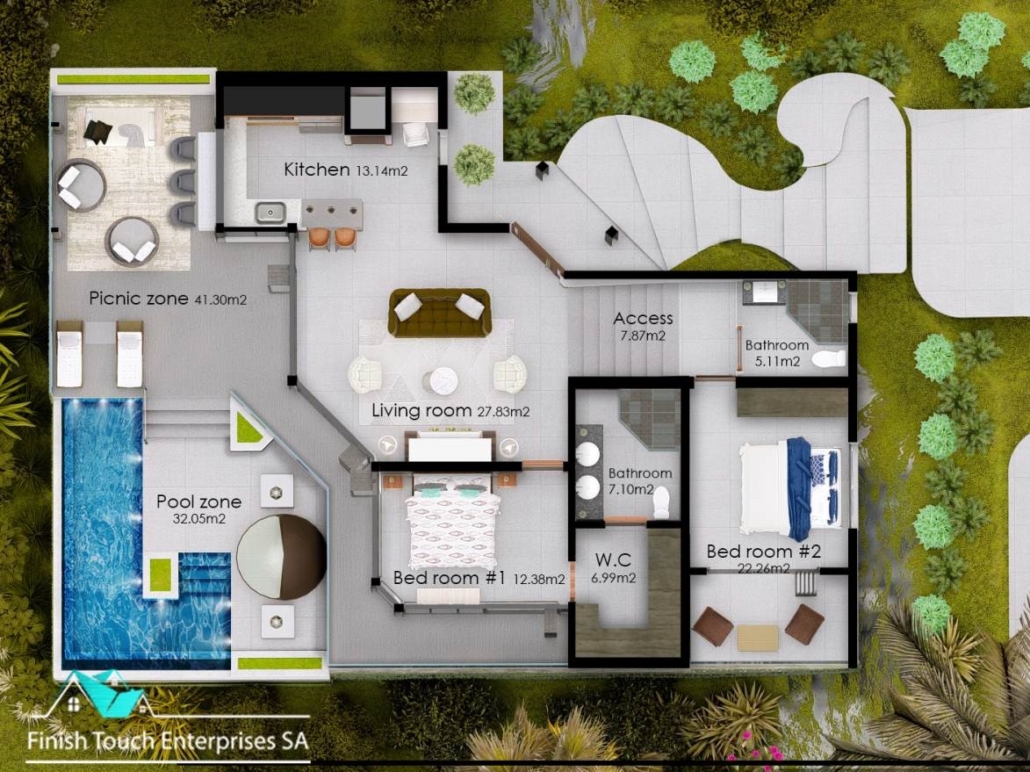 This is a creative and functional design. Strong structural elements, light in weight, ideal for mountain construction. Low construction cost, and minimized labor cost. You certainly receive the best bang for the buck with this home design. Without sacrificing quality or comfort. This affordable two-bedroom home has plenty of area for entertaining guests. With convenient access to the terrace, kitchen, living room, and bathrooms. There is a kitchen pass-through convenient for passing snacks and refreshments.