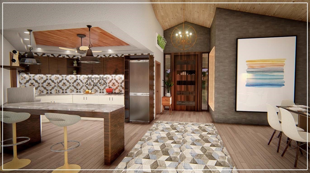 This design has many potentials to customize to specific requirements. There is a rustic element with aesthetics, stone, and wood beams. There are also modern elements on the finishes bringing old to new. The detached casita is a focal point. This is ideal for guests, teenagers, or to use as a studio. This home is surprisingly affordable to build. Many of the finishes are natural and simple. Decorative ceilings follow the roofline, and the decorative beams serve as collar ties. This home is well planned and engineered.